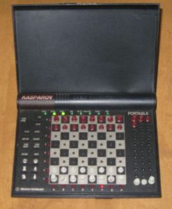The computer was a Kasparov Portable Advanced Trainer, sometimes called the Kasparov Cavalier. It was made by Saitek and branded with the name of Garry Kasparov.